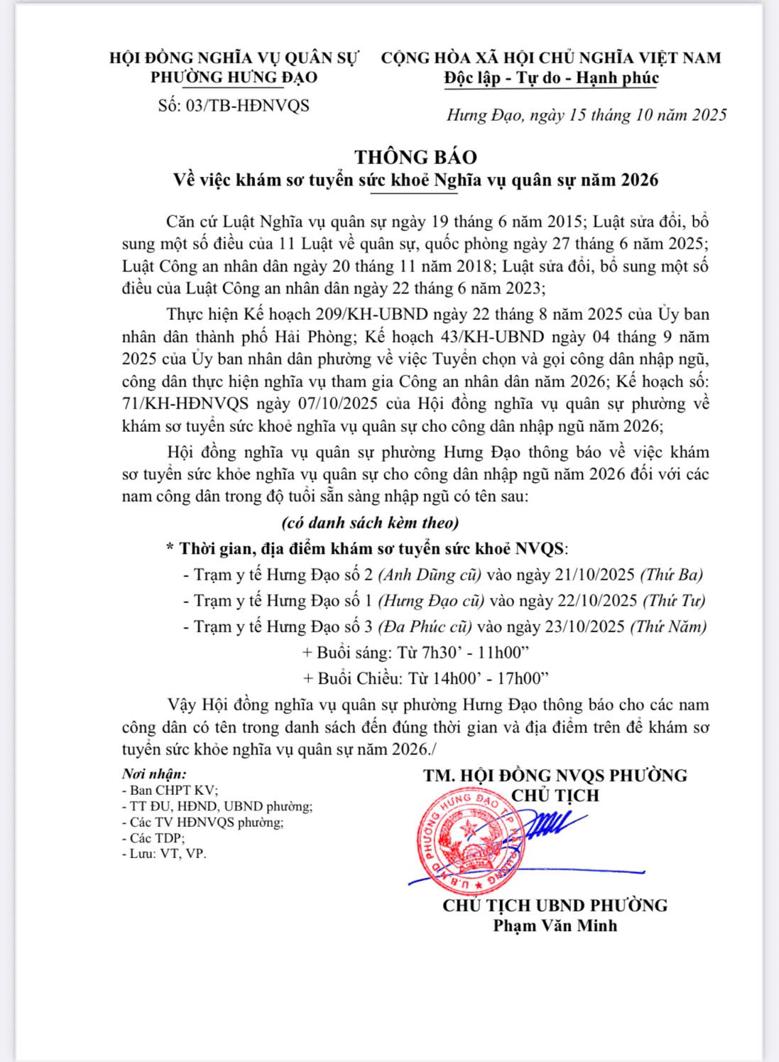 Hội đồng nghĩa vụ quân sự phường thông báo về việc khám sơ tuyển Nghĩa vụ quân sự năm 2026