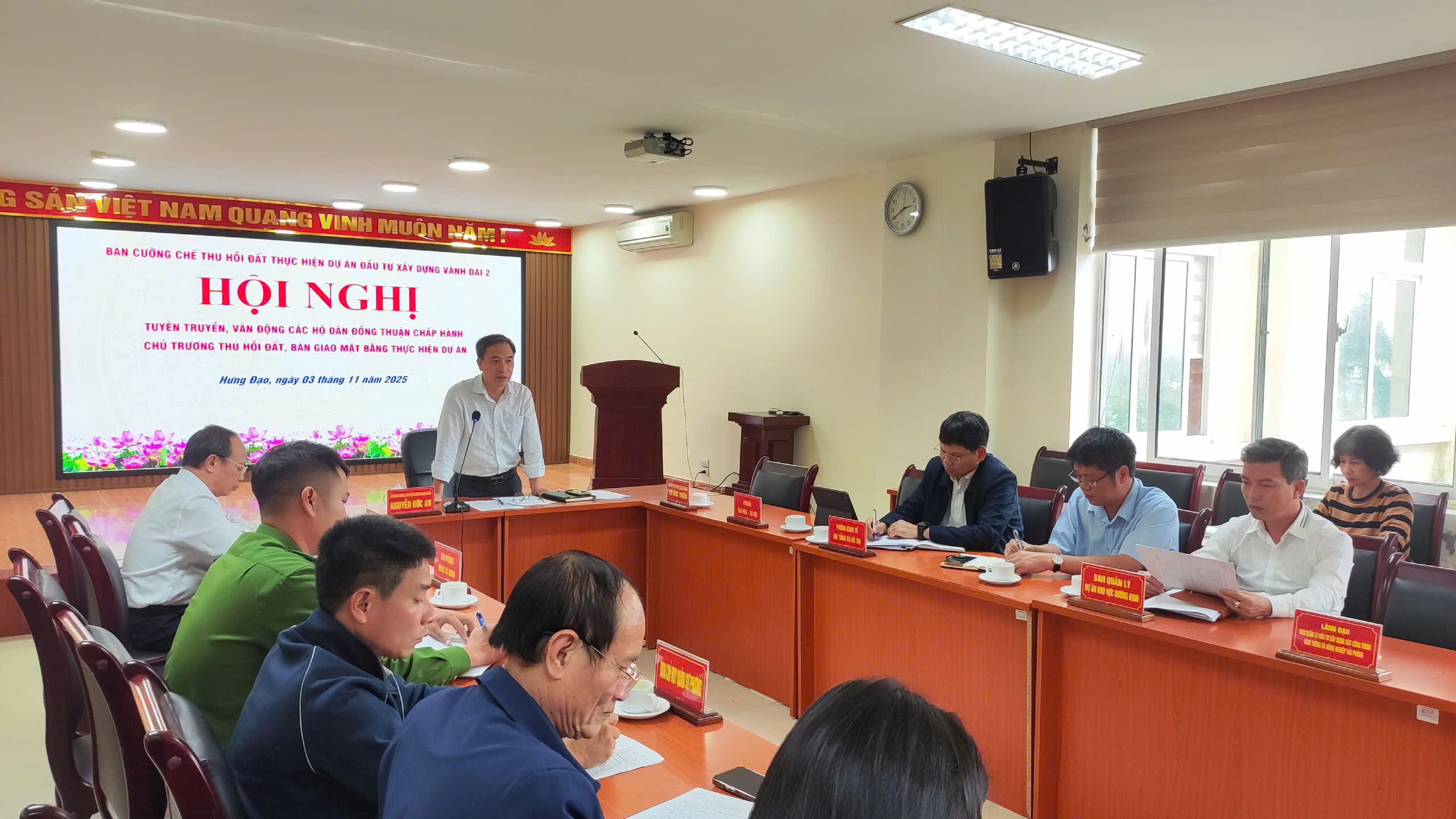 Chiều nay (3/11/3025),Ban cưỡng chế thu hồi đất thực hiện dự án đường vành đai 2 do đồng chí Nguyễn Đức An -PCTUBND, Trưởng ban cưỡng chế- chủ trì đã tổ chức Hội nghị tuyên truyền vận động 8 hộ dân thuộc khu vực đất CTCP Thành Tô và 17 hộ dân thuộc khu đất khu công nghệ cao ( khu bà Cằng) thực hiện các quy định của pháp luật, đồng thuận bàn giao mặt bằng phục vụ dự án đường vành đai 2 đoạn tuyến Tân Vũ- Hưng Đạo- đường Bùi Viện.